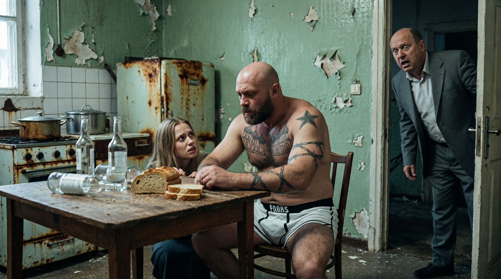 За дверью слышались странные звуки. Глухие, прерывистые. Какие-то шорохи, скрип, а потом — тишина. Наверное, это сосед. Но что он там делает? И где Аня? Я стоял на лестничной клетке, прижимаясь ухом к холодной металлической двери его квартиры, и чувствовал, как внутри меня разрастается липкий, холодный страх. В голову забрались странные мысли. Одна страшнее другой. Я представил, как Миша затаскивает Аню внутрь, как она сопротивляется, как он зажимает ей рот своей огромной ладонью. Я представил ее глаза — полные ужаса, слез, мольбы. Представил, как его грязные руки с татуировками на пальцах срывают с нее одежду. Неужели это всё происходит на самом деле? Я не мог больше ждать. Не мог стоять и слушать. Ярость, смешанная с отчаянием, поднялась во мне, как лава. Я начал барабанить в дверь что есть силы — кулаками, потом уже и ногой. Железо гудело, вибрировало, но держалось. Я кричал так громко, как только мог. Наверное, моими криками я всполошил весь дом. — Миша! Миша, прекрати! Аня, я сейчас! Откройте эту чертову дверь! Помогите! Люди, помогите кто-нибудь! Голос сорвался. Я хрипел, но продолжал бить. Кулаки болели, костяшки саднили. Я не чувствовал ничего, кроме одного желания — пробиться туда, спасти ее. И вдруг позади себя я услышал, как открывается замок общей двери. Я резко развернулся, готовый к чему угодно — к тому, что это соседи снизу пришли на крик, к тому, что это участковый, к тому, что это сам Миша вышел через черный ход. Но то, что я увидел, заставило меня замереть. На пороге стояла Аня. Живая. Целая. В своей куртке, с пакетом в руке. Из пакета торчала буханка хлеба и бутылка молока. Она смотрела на меня широко раскрытыми глазами, и в них был не ужас — удивление. — Аня? — выдохнул я. — Ты тут? А я думал... — Рома? — она поставила пакет на пол. — Что случилось? Я вышла в магазин. Услышала твои крики, когда поднималась. Я думала, он тебя избивает! Я думала, ты зовешь меня помочь! — Я... я искал тебя, — сказал я, и голос мой дрожал. — Тебя не было дома, а у него... мне показалось... Я не договорил. Потому что в эту же секунду открылась дверь соседской квартиры. Медленно, со скрипом, как в фильмах ужасов. На пороге я увидел еле стоящее на ногах тело Михаила. Он был в той же грязной майке, в семейных трусах. Волосы спутаны, глаза заспанные, красные. Он щурился от света, как крот, вытащенный из норы. Похоже, он спал. Или только что проснулся после пьянки. В любом случае, вид у него был очень недовольный. Он перевел взгляд с меня на Аню, потом снова на меня. — Ты нормальный, сосед? — прорычал он. Голос хриплый, с каким-то утробным рыком. — Чего орешь? Чего в дверь ломишься? Людей пугаешь? У меня башка трещит, а ты... — Извините... — выдавил я. Я чувствовал себя полным идиотом. Стоять вот так, перед ним, красным от крика, с разбитыми кулаками, и осознавать, что я только что устроил сцену из-за собственной паранойи. Он просто спал. А Аня ходила в магазин. Ничего не случилось. Всё, что я слышал — это шорохи его пьяного сна или, может быть, телевизора. Миша посмотрел на Аню. Долгим, тяжелым взглядом. Потом снова на меня. — Вы в гости? — спросил он с издевкой. — Могли бы и постучать нормально. А не ломать дверь. — Нет, мы... просто перепутали... — я попятился, нашаривая рукой нашу дверь. — Извините еще раз. Спокойной ночи. — Спокойной ночи, — буркнул он и захлопнул дверь. Мы с Аней быстрее забежали в кварт